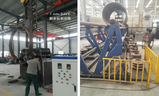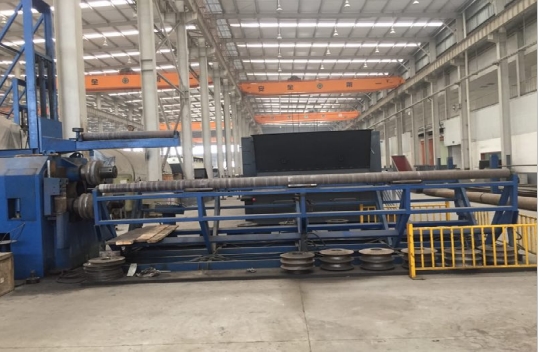 主要由基礎(chǔ)軌道系統(tǒng)、螺旋盤管主機、螺旋管立支撐料架、螺旋管水平出料料架、液壓系統(tǒng)、電控系統(tǒng)、模具等部分組成。