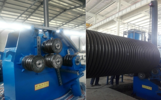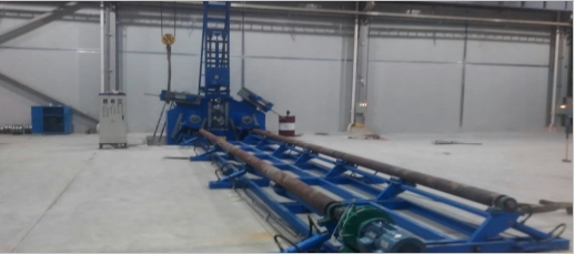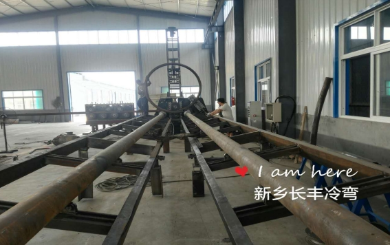 主要由基礎(chǔ)軌道系統(tǒng)、螺旋盤管主機、螺旋管立支撐料架、螺旋管水平出料料架、液壓系統(tǒng)、電控系統(tǒng)、模具等部分組成。
